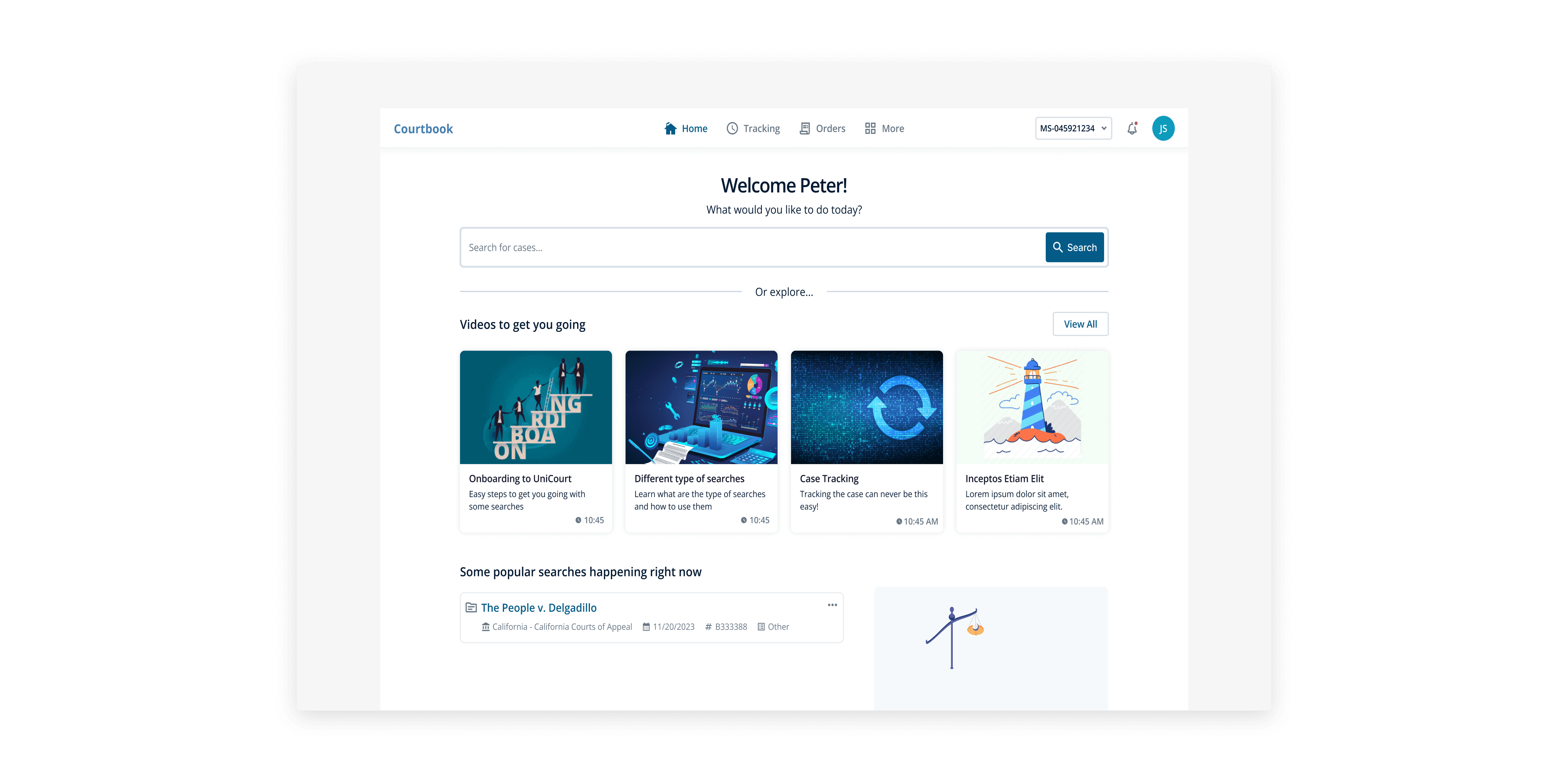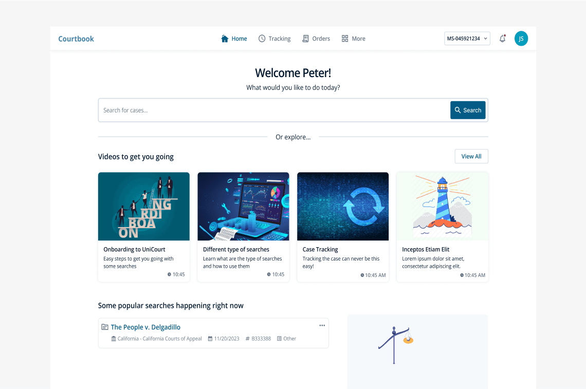 The new Courtbook dashboard is super user-friendly, focusing on clear and easy navigation. A top search bar lets you quickly find cases, while the "Videos to get you going" section offers helpful onboarding resources. Its clean, modern design with a clear hierarchy makes it easy to move from essential tasks to extra resources. With simple access to "Home," "Tracking," and "Orders," the dashboard is designed for a smooth and efficient user experience